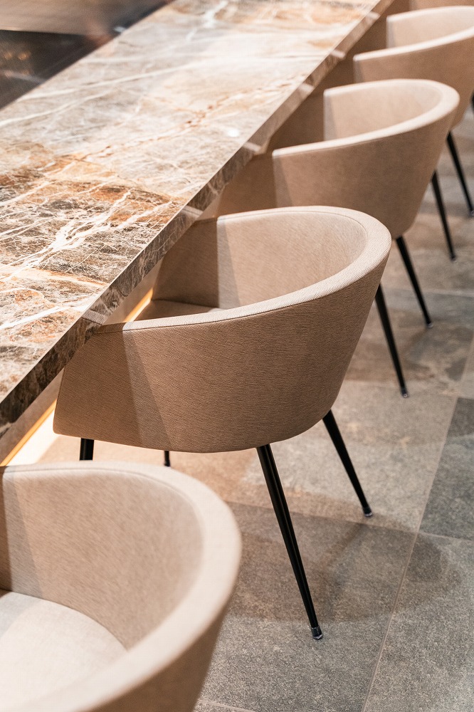 店内は黒を基調とした落ち着きのある空間で、静謐かつラグジュアリーな世界観のなか、カウンター越しに料理人の技を堪能できる設えです。今回の納品では、単価の高い店舗にふさわしい、安っぽさのない上質な意匠性を重視し、モールドウレタン素材のアームチェアをご提案しました。座り心地を重視されていたため、複数種類のサンプルを取り寄せ、実際に座り比べを行ったうえで最終決定。既存のカウンター高さに合わせ、肘が自然に収まるよう肘高にも細かく配慮しています。ベージュ色の生地が黒基調の空間に柔らかな温かみを加え、長時間でも快適に過ごせる上質な空間となりました。